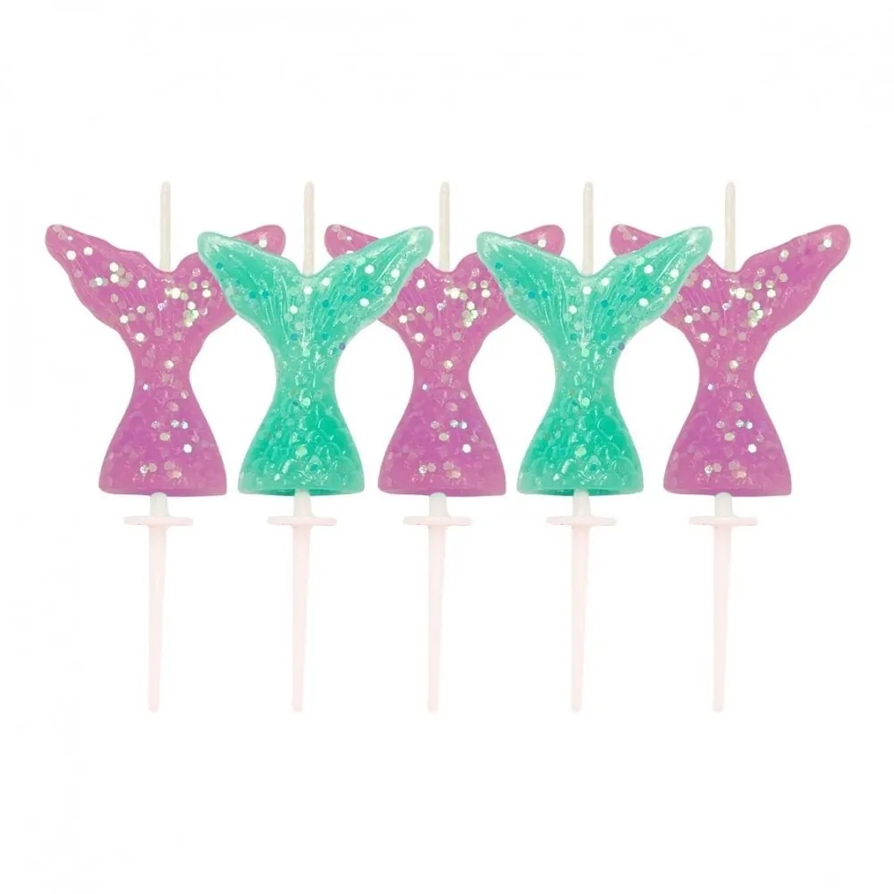 Schattige zeemeerminstaart kaarsjes met glitter. Inhoud: 5 stuks. Afmeting staart: ca 3,5 cm.