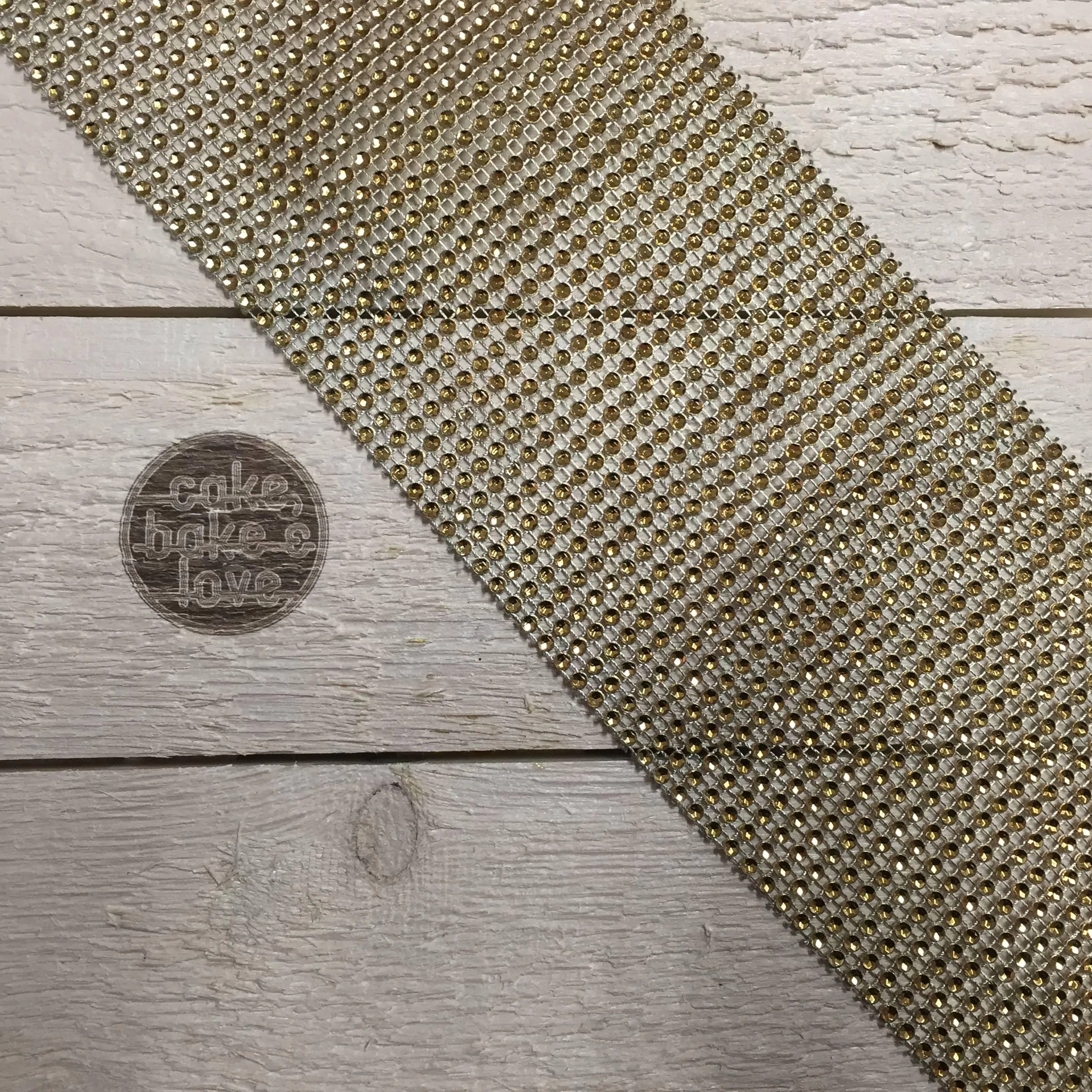 Sierlijk strassband in de kleur goud. Makkelijk op maat te knippen voor om drum of taart ter decoratie (niet eetbaar). Het strassband bestaat uit 24 rijen en is 12 cm hoog. Per meter (dus 24 rijen en 1 meter breed) is het strassband 6 euro. Het is mogelijk meerdere meters te bestellen. Geef dit in de webshop aan door een veelvoud van dit artikel te bestellen. Dus 2 maal dit product is twee meter strassband.