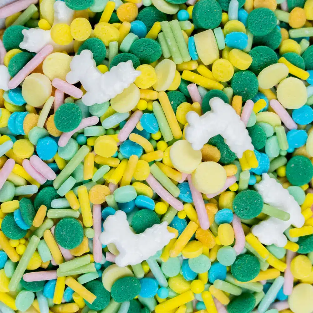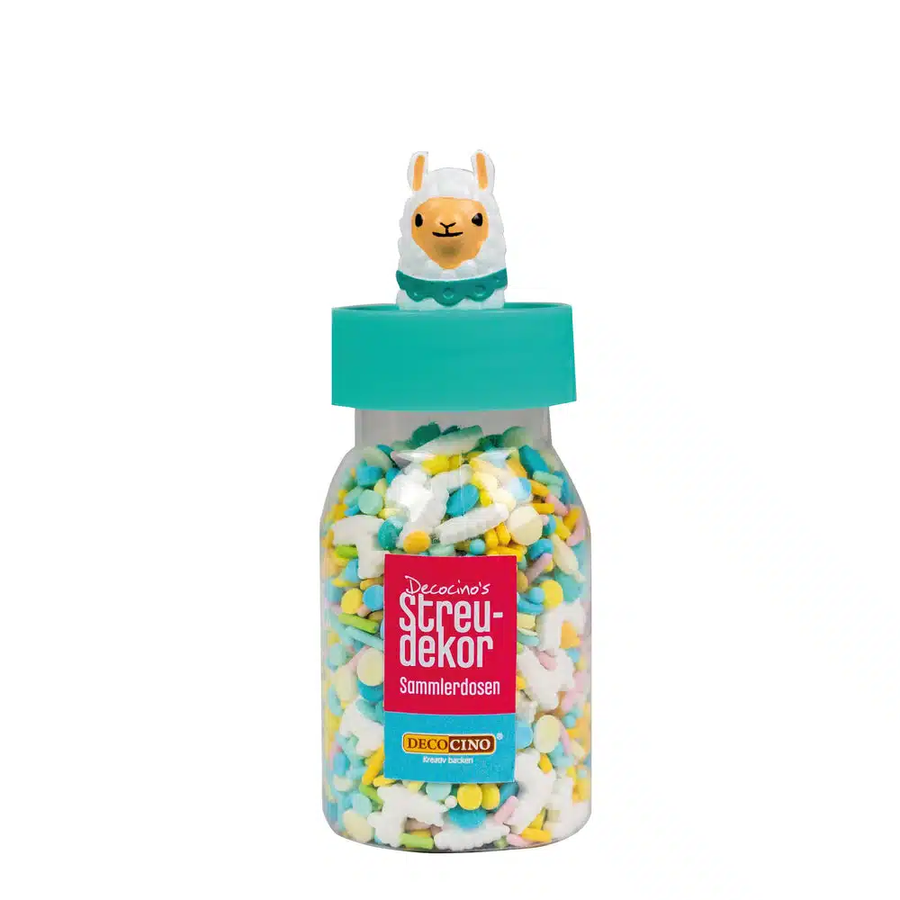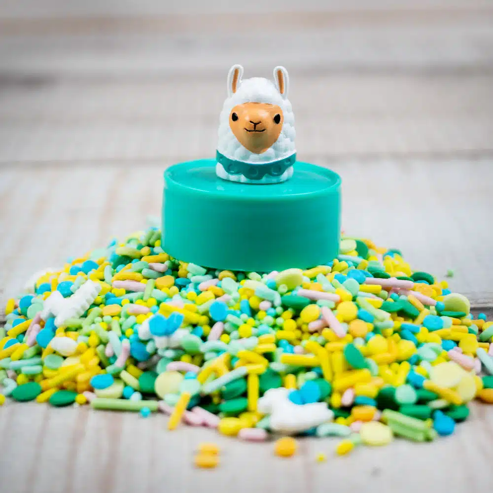 Schattige lama sprinkles met 3D Lama’s en confetti en strands in frisse blauwe, roze, gele en groene kleuren. Deze sprinkles worden verpakt in een schattig sprinkles potje met Lama deksel.