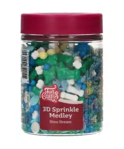 De FunCakes 3D Sprinkle Medleys zijn de makkelijke manier om je baksels in een handomdraai een feestelijk thema te geven! Schattige suikerfiguurtjes, glimmende parels en steeds wisselende coole 3D-figuurtjes zorgen voor een speels en uniek effect. Deze medleys behoren tot ons premium assortiment, herkenbaar aan het potje met het strakke paarse deksel. Elk potje zit vol verrassingen, van musketzaad tot confetti en mimosa’s, perfect gemengd om een extra dimensie aan je baksels toe te voegen. Voor elke gelegenheid hebben we een sprinkle medley om je lekkernijen de ultieme finishing touch te geven. De Dino Dream Medley is perfect voor een verjaardagstaart voor jonge avontuurlijke jongens die een taart met junglethema willen voor hun verjaardag.