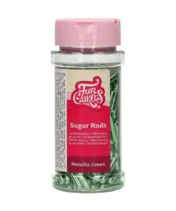 Gebruik de metallic groene sugar rods van FunCakes voor het decoreren van onder andere taarten en cupcakes. De rods zijn circa 2 cm lang en verpakt in een handig strooipotje.