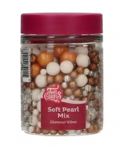 De FunCakes Soft Pearls Mix geeft je taarten, cupcakes en koekjes een prachtige finishing touch. Deze mix van parels in verschillende maten heeft een zachte bite en een elegante glans, perfect voor elke feestelijke gelegenheid. Door hun zachte bite zijn ze ideaal voor jong en oud! Of je nu een bruidstaart, babyshower traktaties of verjaardag cupcakes decoreert, deze parels zorgen altijd voor een magische look! De FunCakes Soft Pearls Mix Glamour Vibes 80g is perfect voor het decoreren van luxe en stijlvolle creaties of een Nieuwjaarstaart.