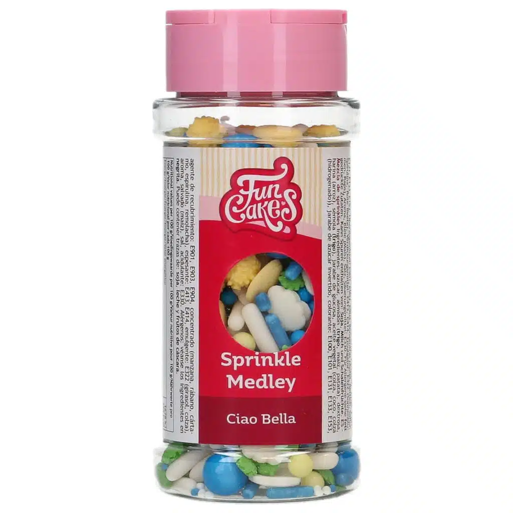 Breng de sfeer van Italië in je baksels met de FunCakes Sprinkle Medley Ciao Bella! Deze kleurrijke mix in blauw, geel, groen en wit doet denken aan de charme van de Amalfikust en de warme kleuren van Toscane. Of je nu taarten, cupcakes of koekjes bakt, deze medley geeft je creaties een speelse en elegante uitstraling. Het voelt als een Italiaanse zomer, maar dan geschikt voor elk seizoen en iedere gelegenheid. Met de FunCakes Sprinkle Medley Ciao Bella maak je van ieder bakmoment een klein mediterraans feestje!