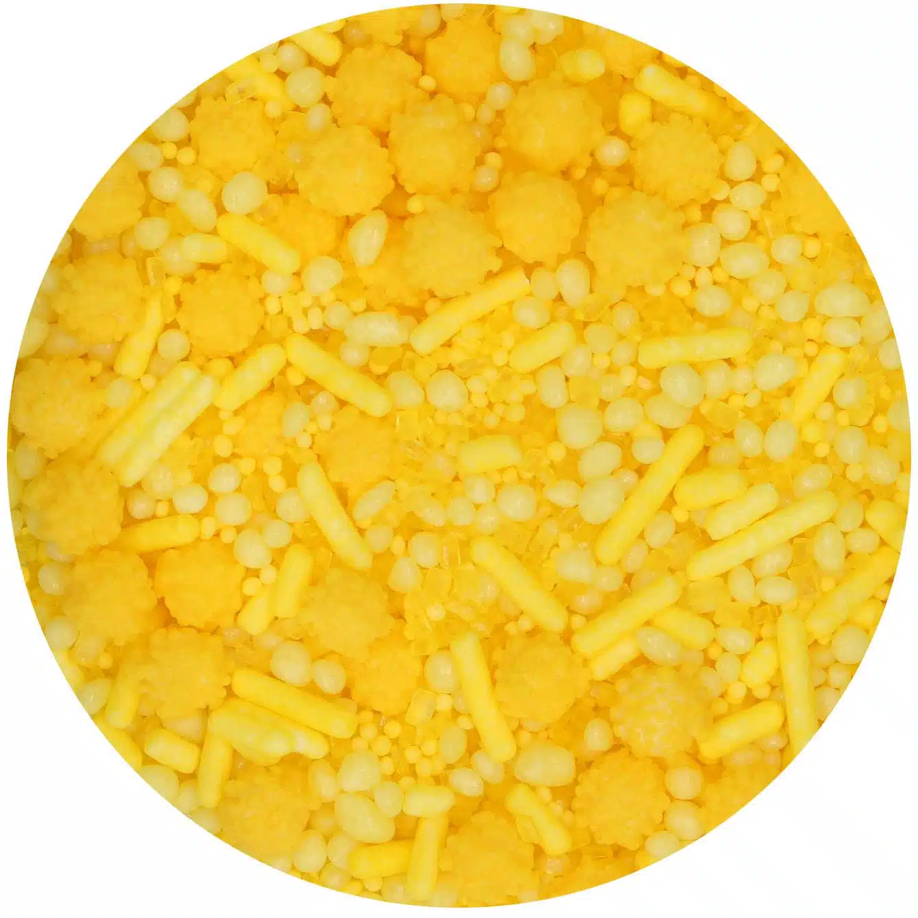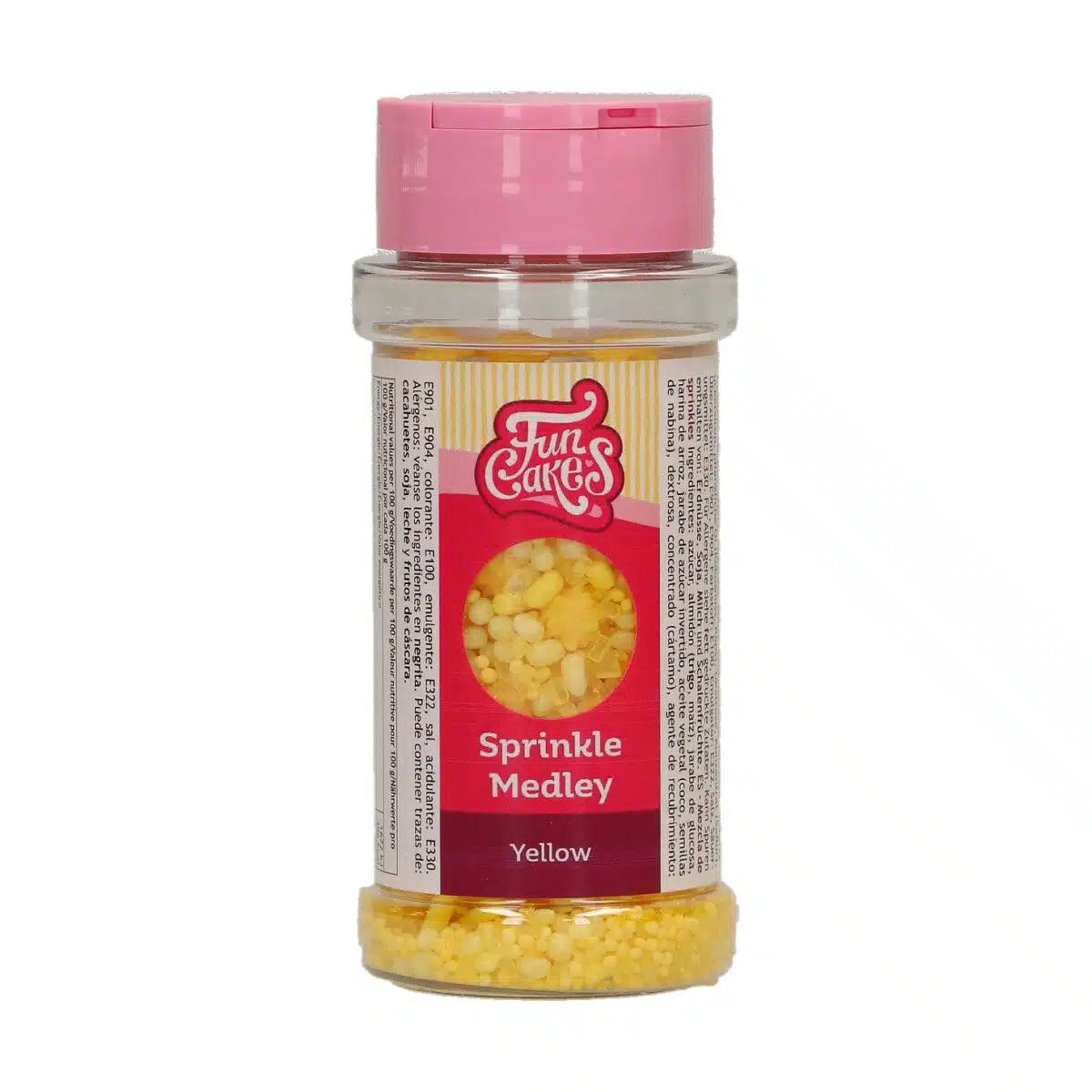 De FunCakes Sprinkle Medleys zijn de makkelijkste manier om je taarten en cupcakes om te toveren tot iets vrolijks in thema. Wij mixen en matchen de leukste strooisels telkens weer tot nieuwe sprinkle medleys. In één potje vind je daarom een combi van bijvoorbeeld suikerfiguurtjes, parels, mimosa’s, confetti, sugar strands en musketzaad. Voor elk thema hebben we wel een sprinkle medley, want we blijven te gekke combinaties vinden om jouw traktaties de perfecte finishing touch te geven. Deze gele Sprinkle Medley gebruik je voor al je zomercupcakes of combineer ‘m met de andere kleuren sprinkle medleys voor elke verjaardagstaart!