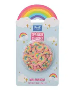 De PME Sprinkle Charms Regenbogen Mini zijn een vrolijke eetbare decoratie voor taarten, cupcakes en andere zoete creaties. Deze sprinkelmix bestaat uit mini-regenboogvormige figuurtjes die zorgen voor een kleurrijke en speelse uitstraling. Met een formaat van ongeveer 11 × 16 mm zijn de regenboogjes goed zichtbaar en perfect als decoratief accent.