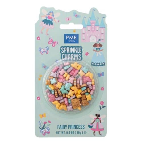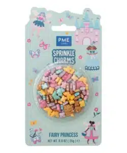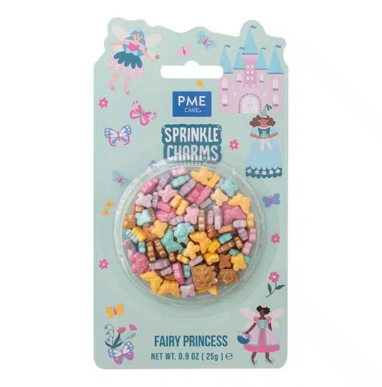 De PME Sprinkle Charms Prinsessen Mix Pastel & Goud zijn een betoverende eetbare decoratie voor taarten, cupcakes en andere zoete creaties. Deze sprinkelmix bestaat uit kroon-, vlinder-, fee- en kasteelvormige figuurtjes in zachte pasteltinten gecombineerd met goudkleurige accenten, wat zorgt voor een sprookjesachtige uitstraling. Met een formaat van ongeveer 12 mm zijn de decoraties goed zichtbaar en perfect als verfijnd detail.