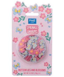 De PME Sprinkle Charms Vlinders & Bloesems zijn een elegante eetbare decoratie voor taarten, cupcakes en andere zoete creaties. De mix bestaat uit lichtblauwe vlinders en roze bloesemvormige bloemetjes met een geel hartje. Met een formaat van circa 16 mm zijn de figuurtjes goed zichtbaar en zorgen ze voor een frisse, lenteachtige uitstraling.