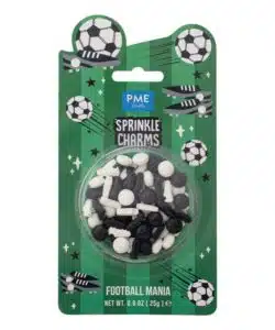 De PME Sprinkle Charms Voetbal & Voetbalschoenen zijn een sportieve eetbare decoratie voor taarten, cupcakes en andere zoete creaties met een voetbalthema. Deze sprinkelmix bestaat uit figuurtjes in de vorm van voetballen en voetbalschoenen, uitgevoerd in zwart en wit voor een herkenbare en stoere uitstraling. Met een formaat van ongeveer 6 × 14 mm zijn de decoraties compact, maar duidelijk zichtbaar.