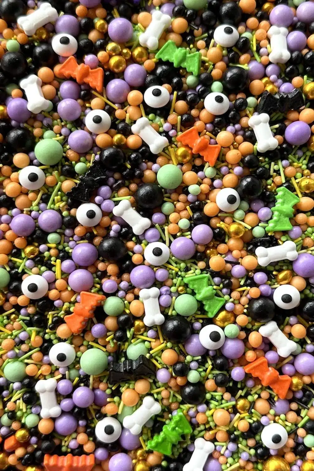 Kleurrijke Halloween sprinkles in de halloween kleuren paars, groen, geel, oranje en zwart. Met verschillende figuurtjes, zoals ogen, vleermuizen en botjes. Leuk voor in de soep van de heksenketel taart!