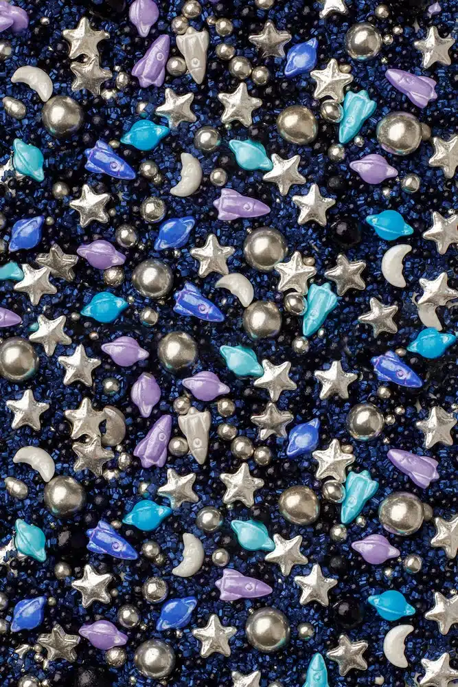 Met deze super gave Space sprinkles versier je de meest gave Space cucpakes, taarten en andere lekkernijen. Deze stoere sprinkles mix bevat onder andere sprinkles in de vorm van een raket, planeet, maan en sterren.