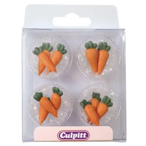 Maak je carrot cake helemaal af met deze suikerdecoraties in de vorm van wortels! Ook leuk om te gebruiken op taarten, cupcakes en koekjes. Ingredi«nten: suiker, maâzena, ei albumine, kleurstoffen: E102, E129, E133. E102 en E129 kan de activiteit of oplettendheid van kinderen nadelig beânvloeden. Voor allergenen zie de vet gedrukte ingredi«nten. Inhoud: 12 decoraties. Afmeting: circa 2,5 cm.