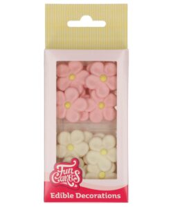 Plaats de FunCakes Fondant Decoraties in een mooie swirl op een cake of cupcake, of in royal icing op een koekje. Op deze manier geef je je lekkernijen in een mum van tijd een passend thema. Deze Daisies set bevat 12 decoraties: 6 roze en 6 witte madeliefjes. Ze zijn een vrolijke toevoeging aan elke taart en perfect voor Pasen of lente-traktaties.