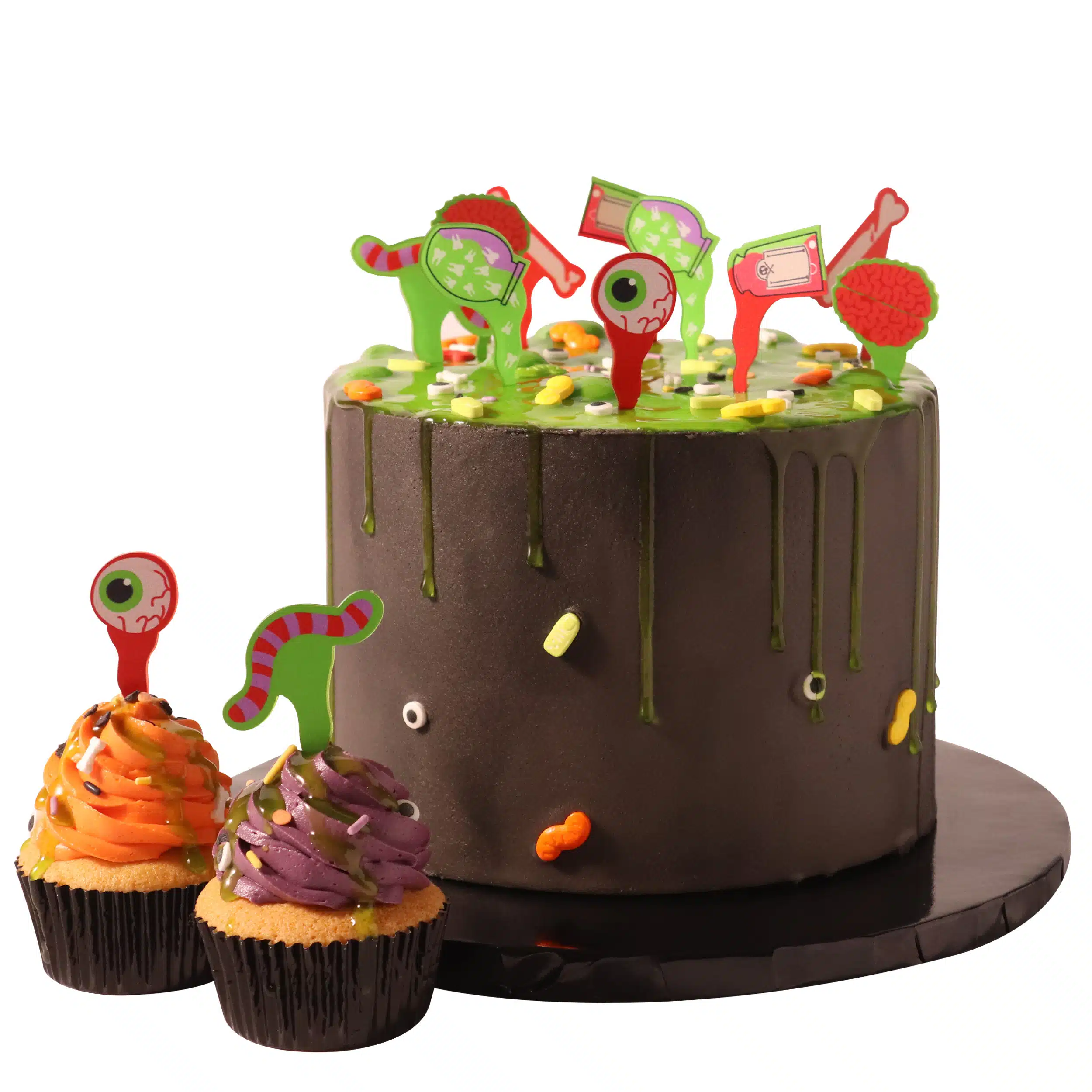 Set bevat: 1 x 99g tube eetbaar groen slijm, 1 x 60g zakje griezelige strooisels, 12 x angstaanjagende toppers. Ideaal formaat voor taarten van 6 – 8 inch of maakt 12 cupcakes.