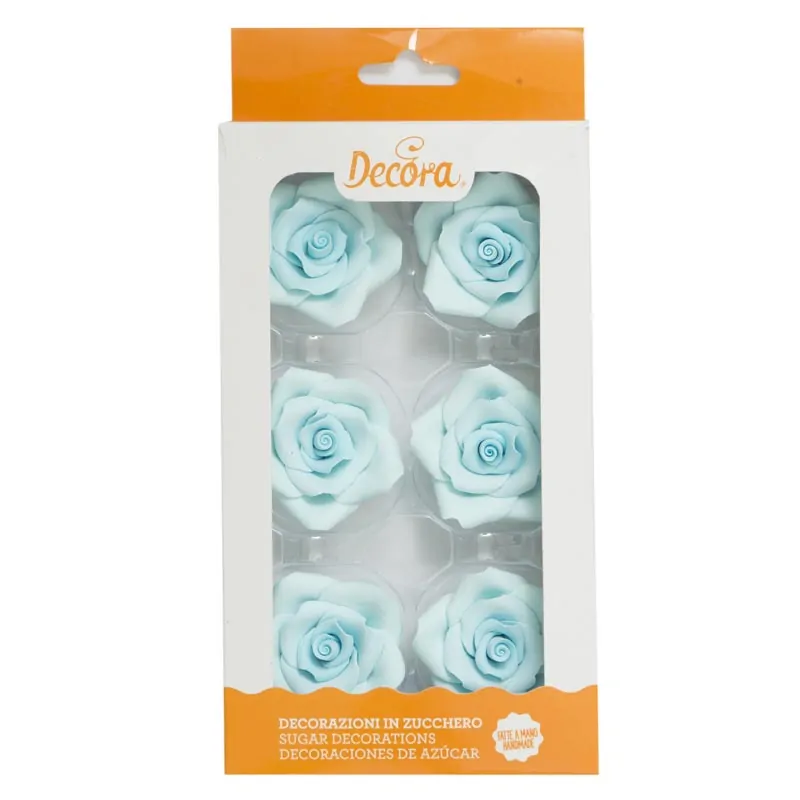 Suikerdecoraties 6 grote licht blauwe rozen 5 cm