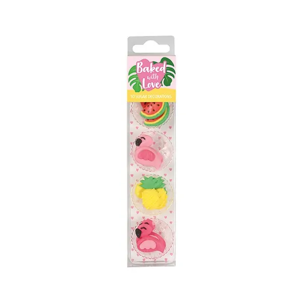 Vrolijke suikerfiguurtjes van Flamingo’s, ananas en meloen. Inhoud 10 stuks. Afmeting ca 25 mm.
