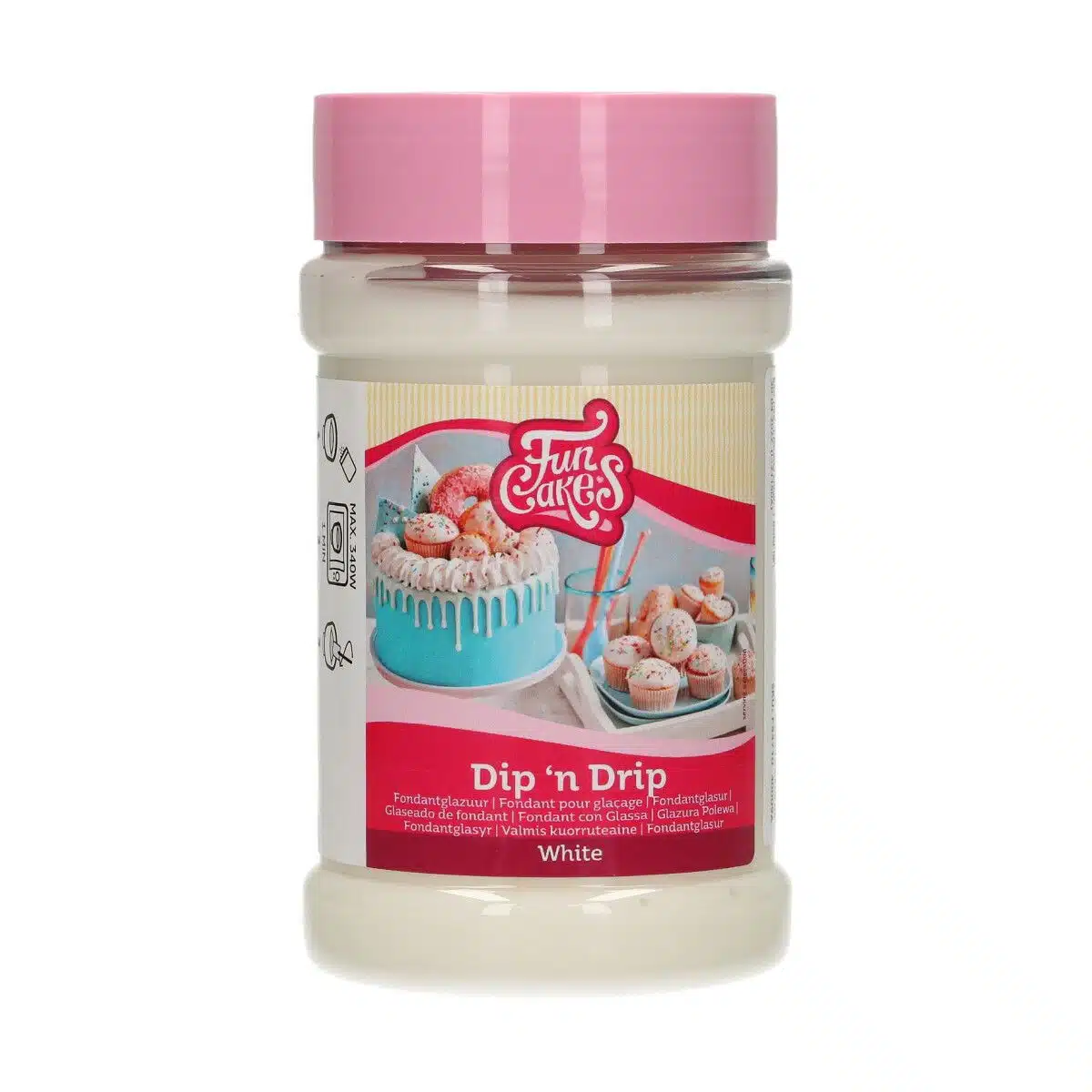 De Dip ’n Drip van FunCakes is ook wel bekend als witte fondant glazuur of smelt fondant. Met dit glazuur kun je je cupcakes of taarten voorzien van een mooi laagje dat uithardt. Smelt de Dip ’n Drip eenvoudig in de magnetron en doop de cupcake erin of giet het over de taart. De glaze droogt goed op, geeft een prachtige glans en is gemakkelijk te kleuren in iedere gewenste kleur. Het is tevens ook eenvoudig te gebruiken om wat accenten aan te brengen d.m.v. een spuitzak