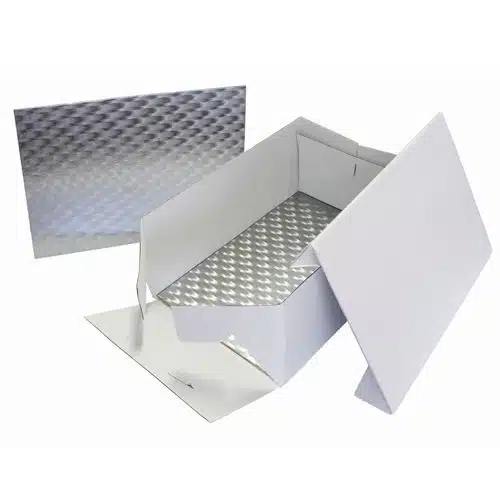Vervoer je taart in de stevige rechthoekige kartonnen taartdozen van PME. De taartdoos wordt geleverd met een zilveren rechthoekige cake board (3 mm dik).