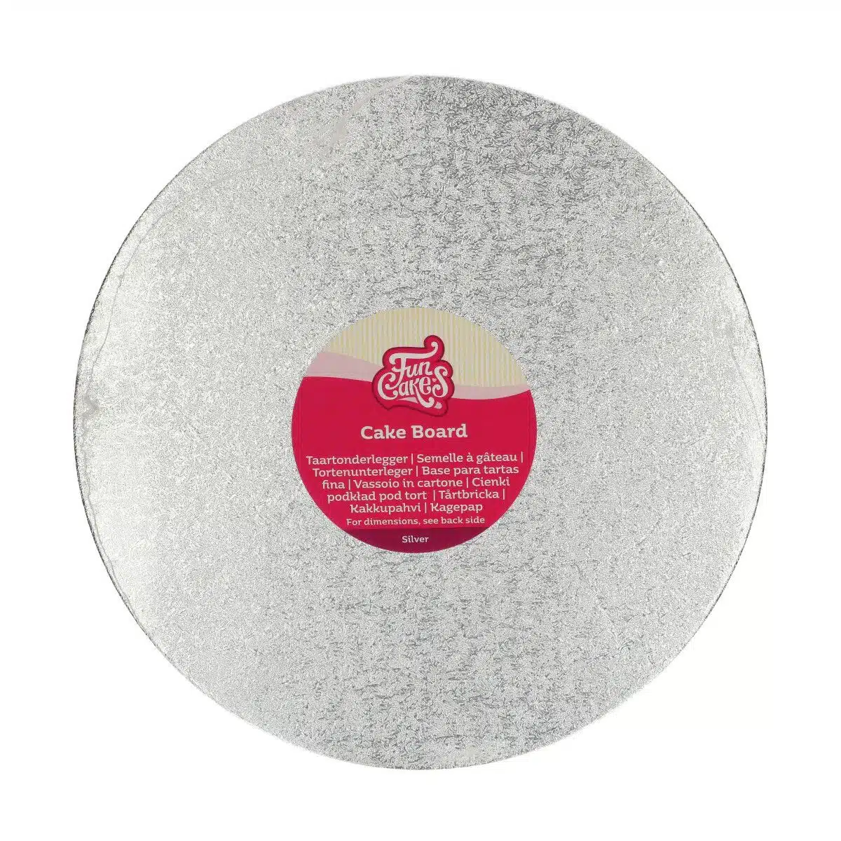 Een rond board in de kleur zilver van hoge kwaliteit met een luxe uitstraling. Dit bord kan dienen als onderbord voor taarten en heeft een diameter van circa 27,9 cm en is 4mm dik. Het onderbord voor taarten is bij normaal gebruik meerdere malen te gebruiken.