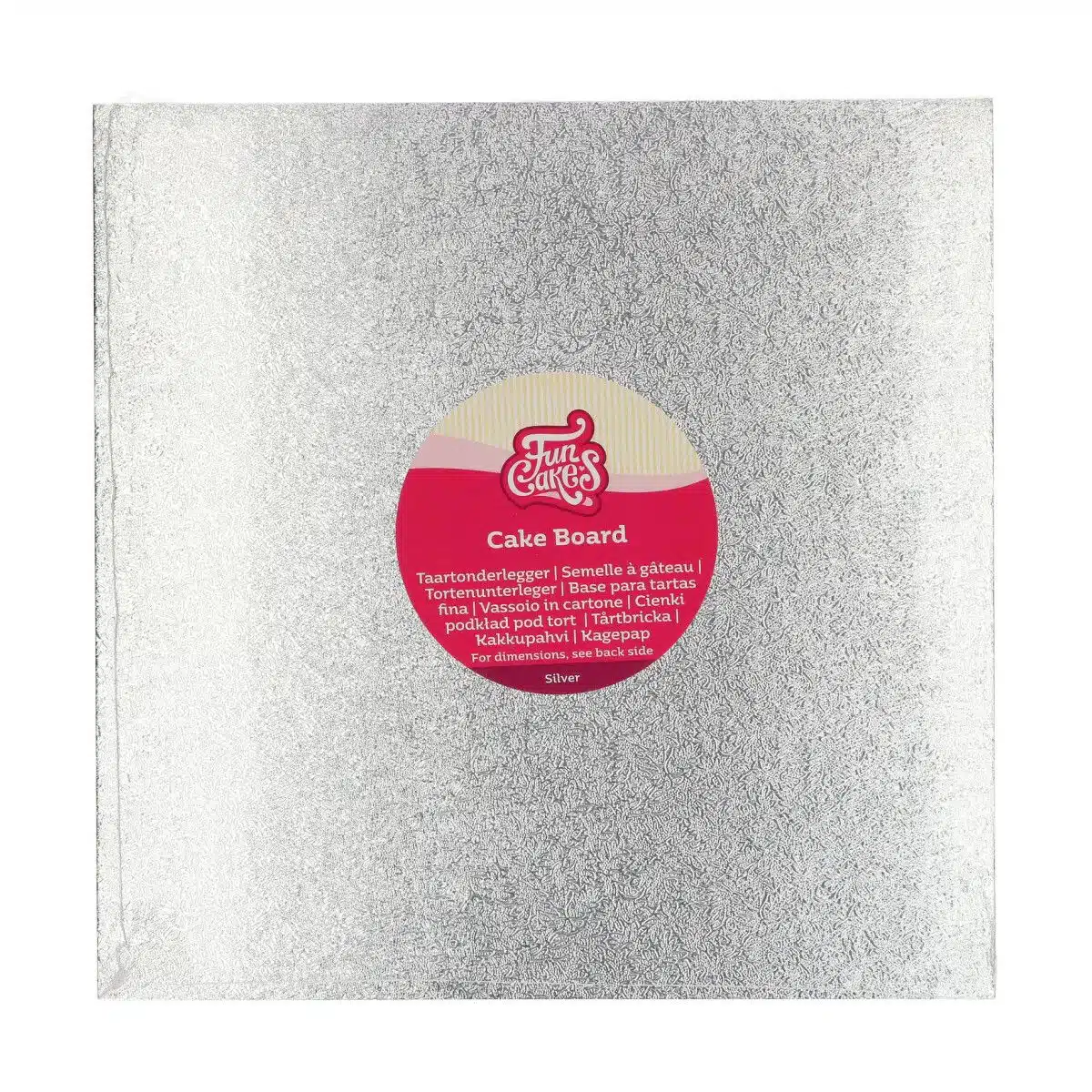 Een vierkant zilverkleurig bord van FunCakes dat kan dienen als onderplaat voor taarten. Het board heeft luxe uitstraling en is van stevige kwaliteit. Het onderbord is bij normaal gebruik meerdere malen te gebruiken.