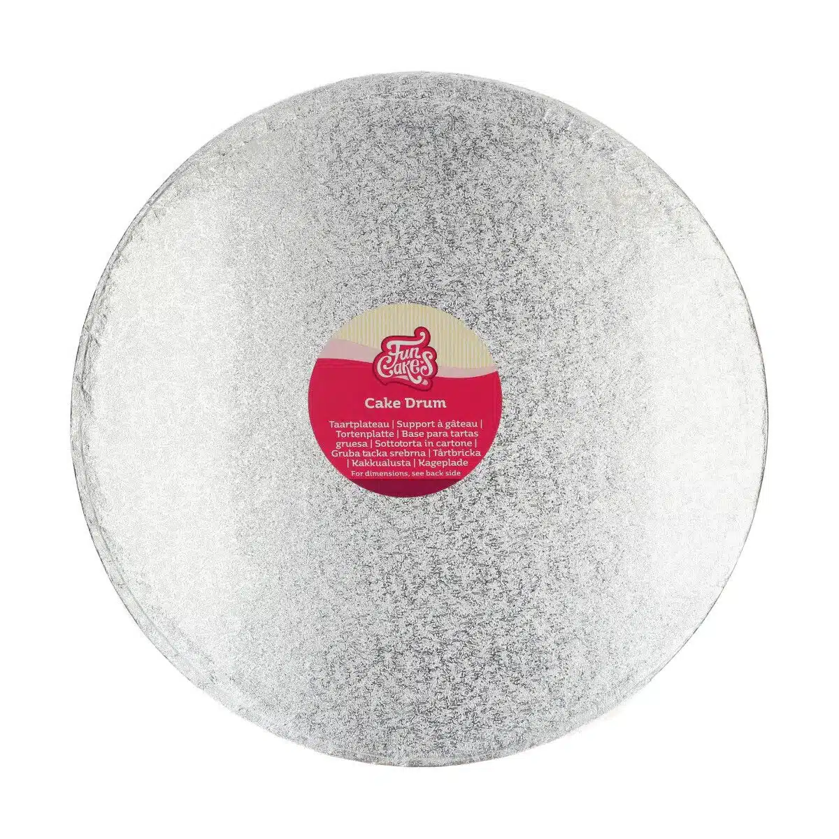 Een ronde drum met een diameter van circa 35,6 cm en een dikte van 12 mm. Het onderbord voor taarten in de kleur zilver is van hoge kwaliteit. Kan bij normaal gebruik meerdere malen worden gebruikt.