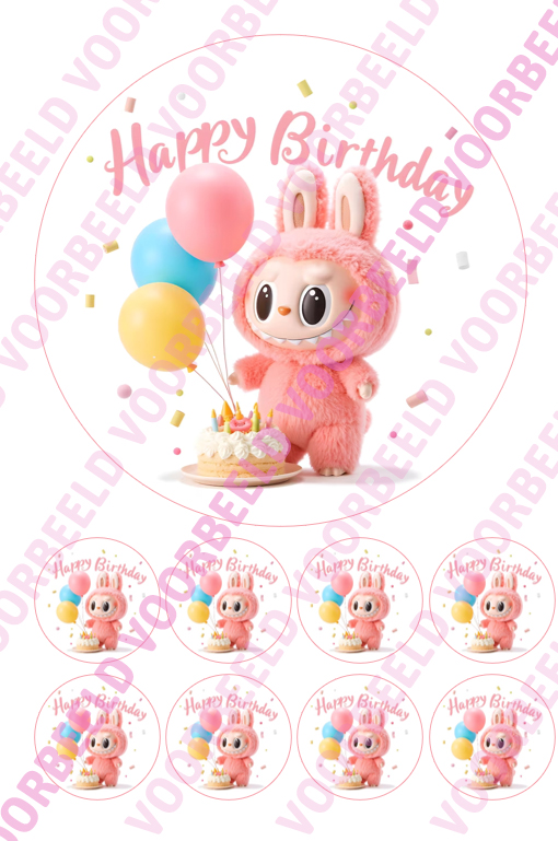 Eetbare Taartprint Labubu Happy Birthday – 18 cm rond rond + 8 cupcake rondjes