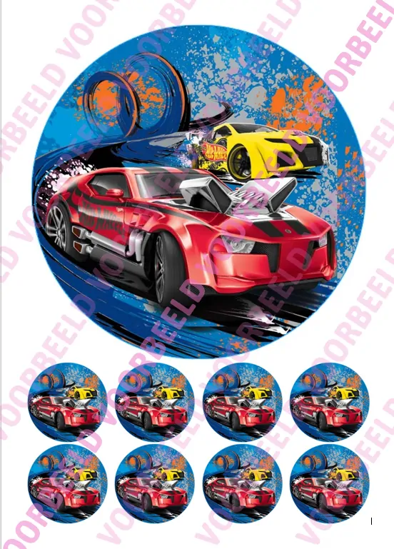 Eetbare Taartprint Hotwheels 4 – 18 cm rond + 8 cupcake rondjes