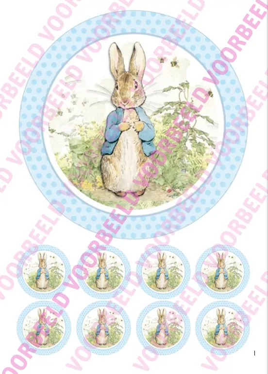Eetbare Taartprint Pieter Konijn 1 – 18 cm rond + 8 cupcake rondjes