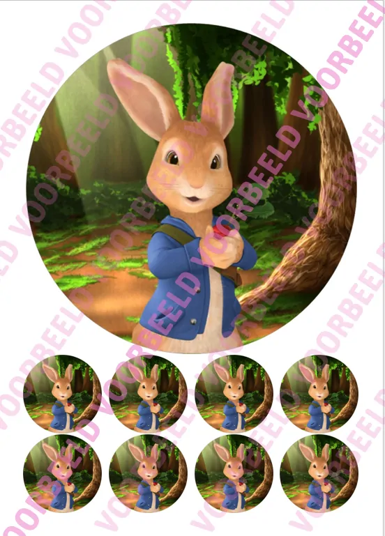Eetbare Taartprint Pieter Konijn 4 – 18 cm rond + 8 cupcake rondjes