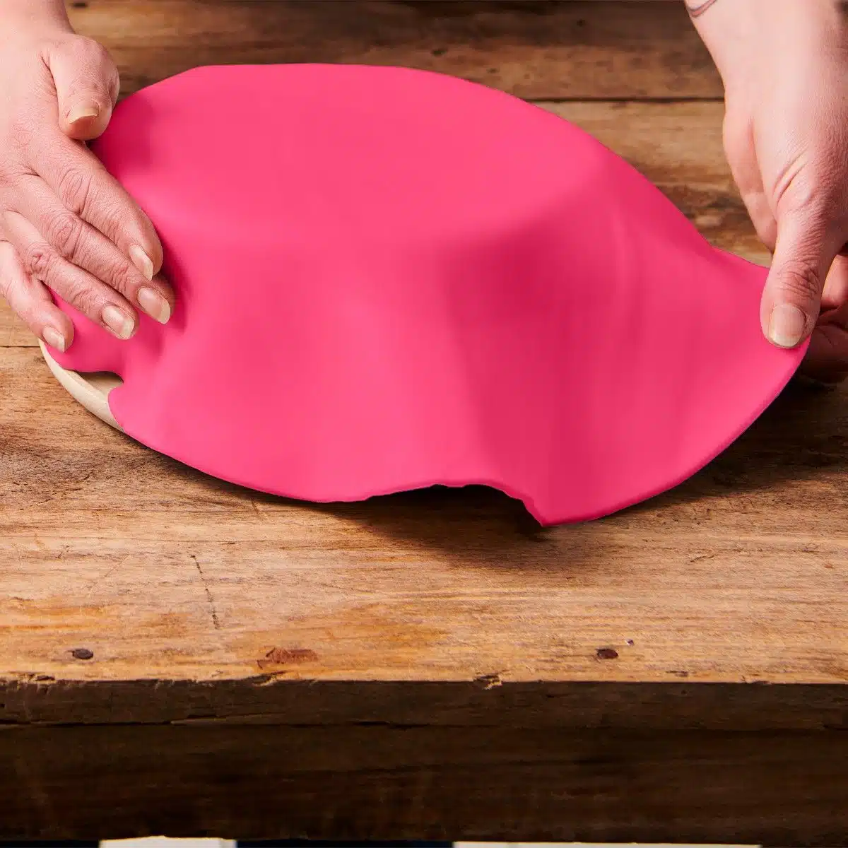 De schijf met fondant heeft een donkerroze kleur en een heerlijke vanillesmaak.