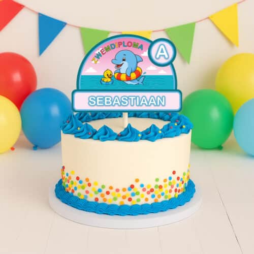 Hoera het zwemdiploma is binnen! Dat verdient een taartje. Met deze gepersonaliseerde taarttopper maak je jouw taart nog specialer.