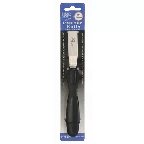 Palette knife van PME met een hoek. Dit palet mes is perfect voor het verspreiden van bijvoorbeeld royal icing of botercréme op je taart. Het mes is voorzien van een ergonomisch ontworpen plastic handvat en is gemakkelijk in gebruik. Geschikt voor de vaatwasser.