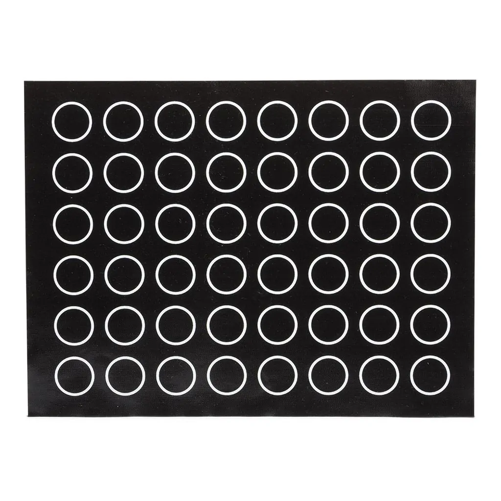 Bak perfect gevormde macarons met deze bakmat van Patisse! Deze mat heeft 48 vormpjes, dus je kunt 24 macarons ermee maken. De macaron bakmat is plat en de rondjes zijn erop gedrukt. Deze mat heeft geen inkepingen.
