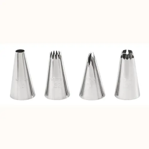 Gebruik deze vierdelige Wilton tip set voor basis decoraties technieken en om snel lijnen van stippen, een rand van schelpen, prachtige blad ruches en gedurfde randen te maken. Of je nu prachtige randen aan de zijkanten van een taart wilt toevoegen, er zijn volop mogelijkheden. Voor en na elke gebruik, afwassen in een warm sopje. Goed afspoelen en laten drogen. De spuitmondjes zijn ook geschikt voor de vaatwasser (mits in bovenste lade). Inhoud: 4 spuitmondjes (10, 32, 70, 105).
