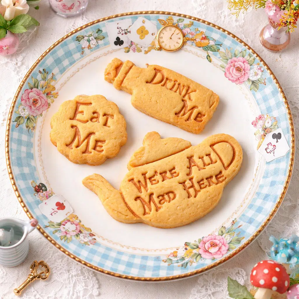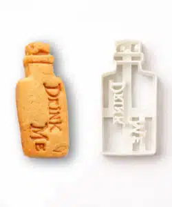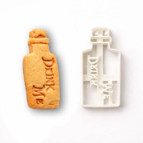 Leuke uitstekers in Alice in Wonderland stijl om een koekje te maken in de vorm van een flesje met de tekst “Drink Me” of te gebruiken met fondant of marsepein voor het maken van decoraties voor op cupcakes en taarten.