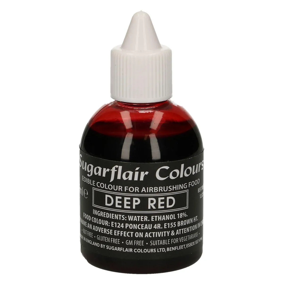 Met de airbrush kun je prachtige details toevoegen aan je creaties. Deze eetbare colouring van Sugarflair is speciaal ontworpen voor gebruik met een airbrush. De diep rode kleurstof is vloeibaar. Ingrediënten: water, ethanol voedselkwaliteit (18%), kleurstof: E124, E155. E124 kan de activiteit of oplettendheid van kinderen nadelig beïnvloeden. Dit product is GM vrij en geschikt voor vegetariërs. Inhoud: 60 ml.
