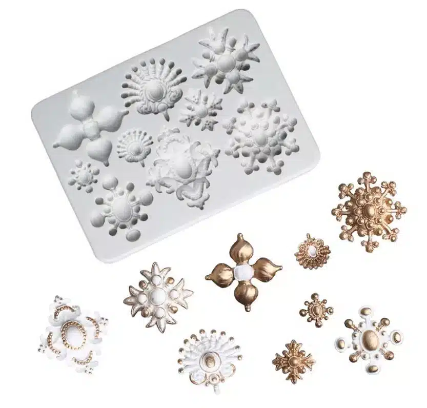 Maak luxe cake decoraties met deze siliconen mal Broches. Deze fondant mould bevat meerdere elegante ontwerpen en is ideaal voor bruidstaarten, chique cupcakes en stijlvolle desserts.