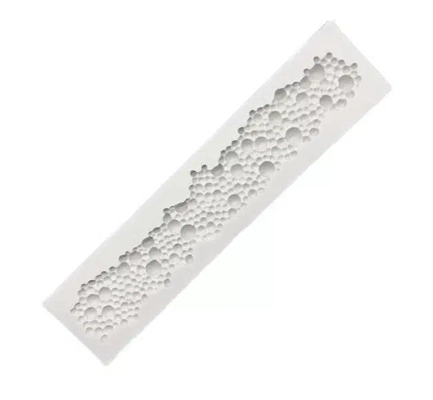 Siliconen mal met een mooie border van meerdere parels voor de afwerking van jouw taart. Ook te gebruiken als bubbels. Afmeting border: 20 x 3,5cm. De siliconen mallen kunnen gebruikt worden met rolfondant, sugar florist paste (gum paste), modelling paste (Mexican paste), marsepein, chocola, candy melts, ismolalt en koud porselein. Tip: plaats de gevulde vorm even in de koelkast of vriezer om deze gemakkelijker te lossen. Onderhoud: reinig de vorm in een warm sopje, spoel af en laat drogen – bij voorkeur aan de lucht, anders blijven er vezels van de theedoek in de vorm.