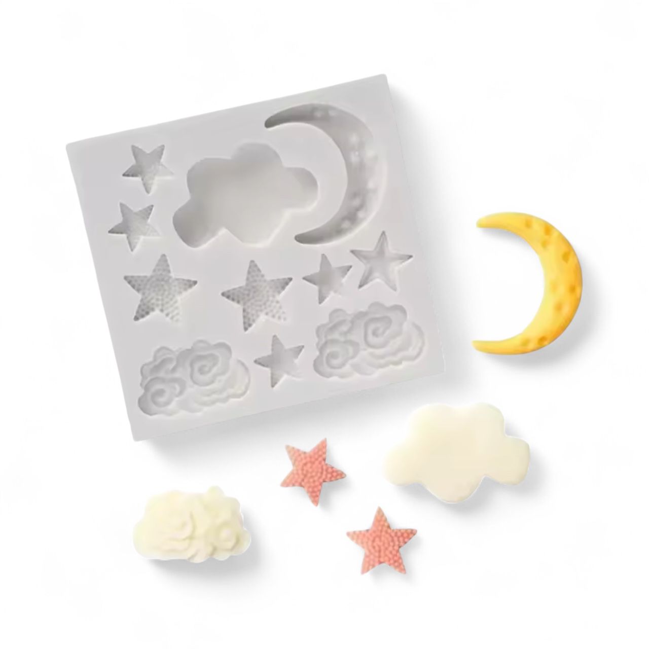 Leuke siliconen mal voor al jouw dromerige taarten, zoals bijvoorbeeld een babyshower taart. Met deze mal maak je gemakkelijk sterren, wolkjes en een maan.