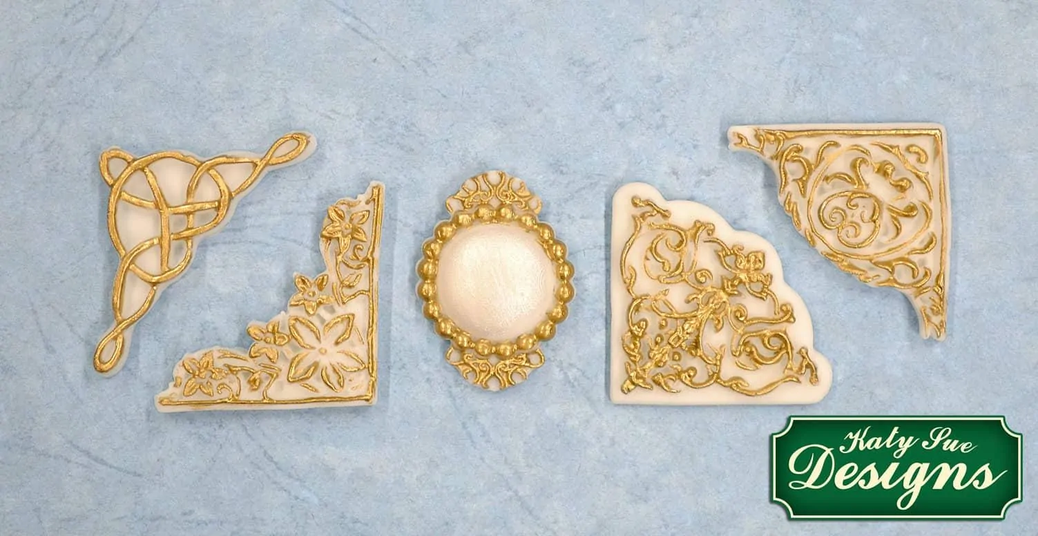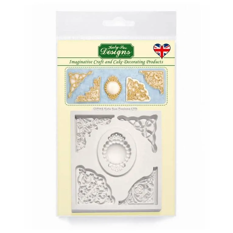 Deze decoratieve mal met hoekstukken is perfect voor meerdere gelegenheden. Deze sierlijke hoeken zijn zeer geschikt voor vintage taarten of om een elegante touch te geven aan jouw taarten of cupcakes. Deze siliconen mal bevat vier hoekstukken en mooie broche in het midden van de mal. Alle siliconen mallen van Katy Sue moulds zijn gemaakt in Engeland en zijn voedselveilig. De mallen kunnen gebruikt worden met rolfondant|sugar florist paste (gum paste)|modelling paste (Mexican paste). Afmetingen: Broche: 35 x 25 x 6mm Hoeken: 35 x 35 x 5mm
