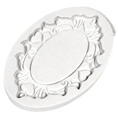 Siliconen mal met daarin een ovaal schild, waar bijvoorbeeld een naam of tekst gezet kan worden. Alle siliconen mallen van Katy Sue moulds zijn gemaakt in Engeland en zijn voedselveilig. De mallen kunnen gebruikt worden met rolfondant, sugar florist paste (gum paste), modelling paste (Mexican paste), marsepein, chocola, candy melts, ismolalt en koud porselein.