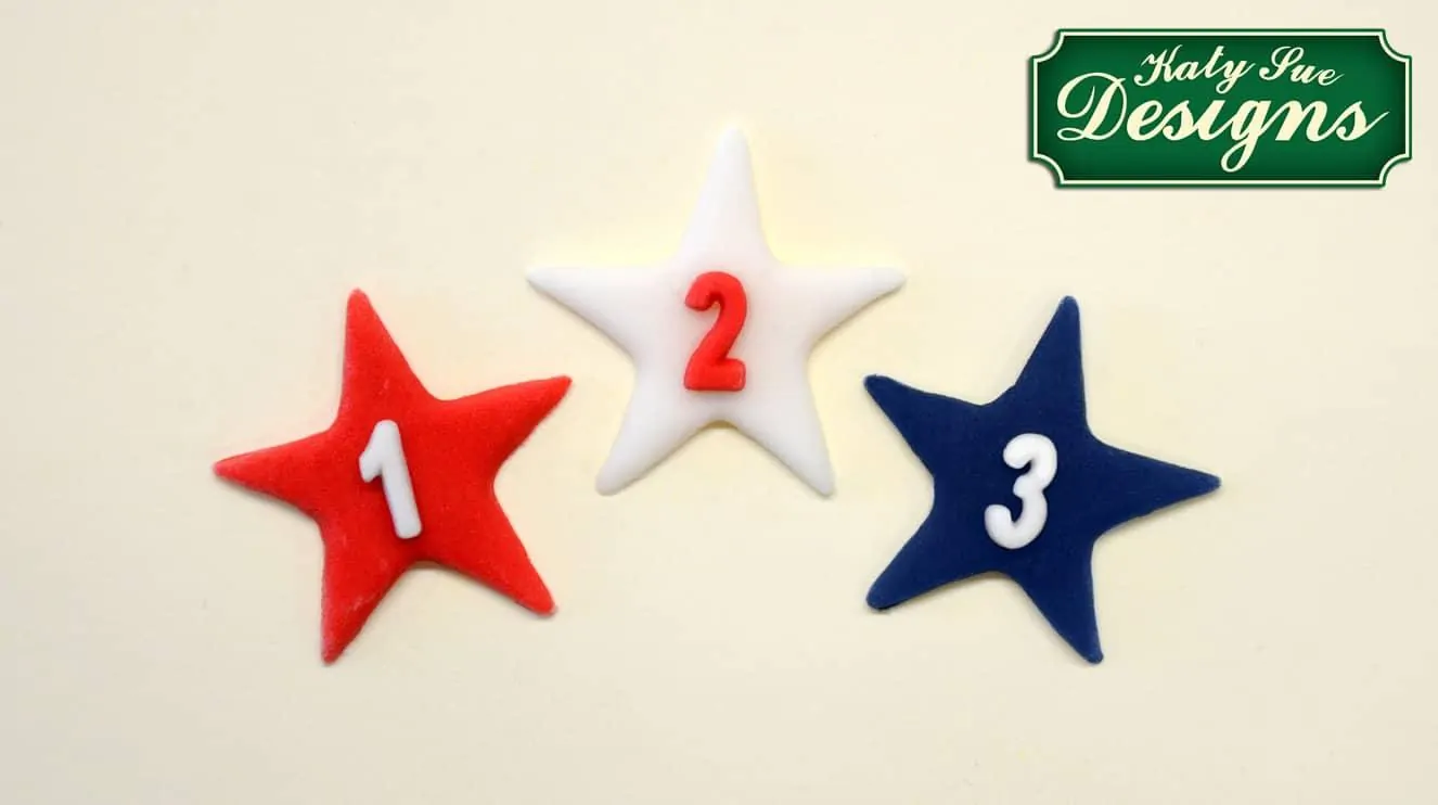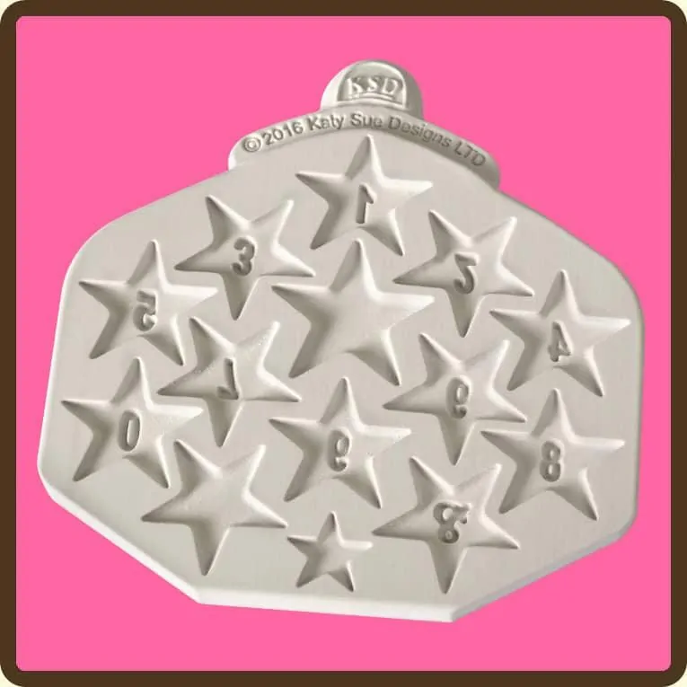 Siliconen mal met daarin sterren met cijfers. Stars Numbers afmetingen 27mm x 26mm x 5mm / grote lege sterren 31mm x 30mm x 3mm / kleine lege sterren 16mm x 15mm. Alle siliconen mallen van Katy Sue moulds zijn gemaakt in Engeland en zijn voedselveilig. De mallen kunnen gebruikt worden met rolfondant, sugar florist paste (gum paste), modelling paste (Mexican paste), marsepein, chocola, candy melts, ismolalt en koud porselein.