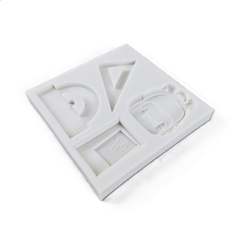Mooie grote en stevige siliconen mal met daarin vier ontwerpen van een rugzak, boek en twee soorten linialen. Leuk voor al jouw back to school cupcakes en taarten!