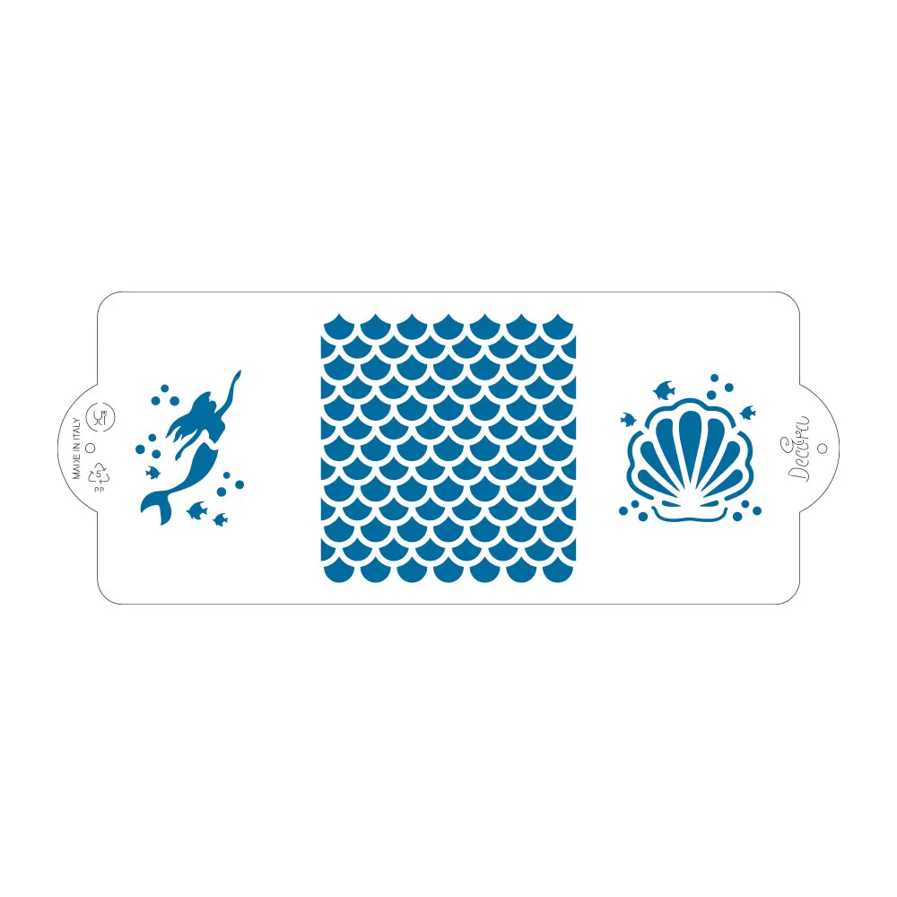 Veelzijdig stencil met 3 verschillende afbeeldingen in het thema Zeemeermin. Het stencil is gemaakt van voedselveilig plastic en te gebruiken voor het maken van patronen op onder andere taarten, dessert en koekjes met Royal Icing, botercrème, cacao, gekleurde dusts, airbrush of foodpaint. Afmetingen stencil: 10 x 25 cm.