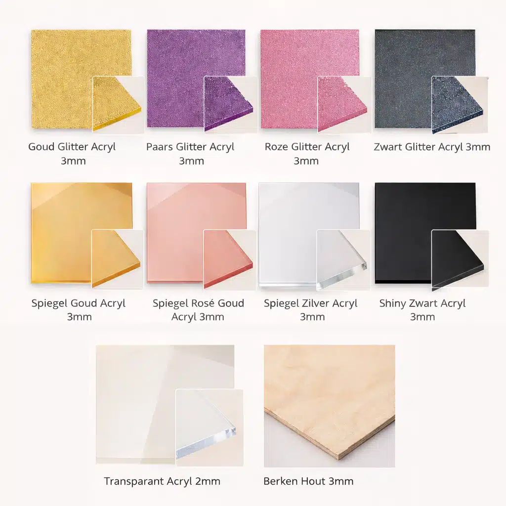 Je kunt kiezen uit hout of uit verschillende luxe acrylsoorten: Glitter goud, Glitter roze, Glitter zwart, Glitter paars, Spiegel rosé, Spiegel zilver, Spiegel goud, Shiny zwart.