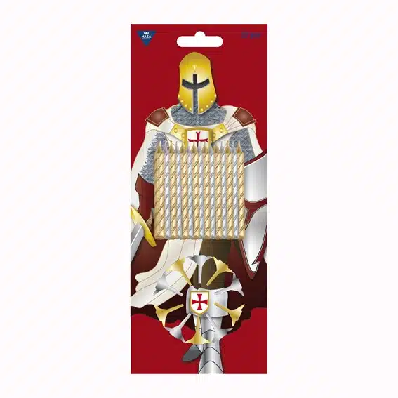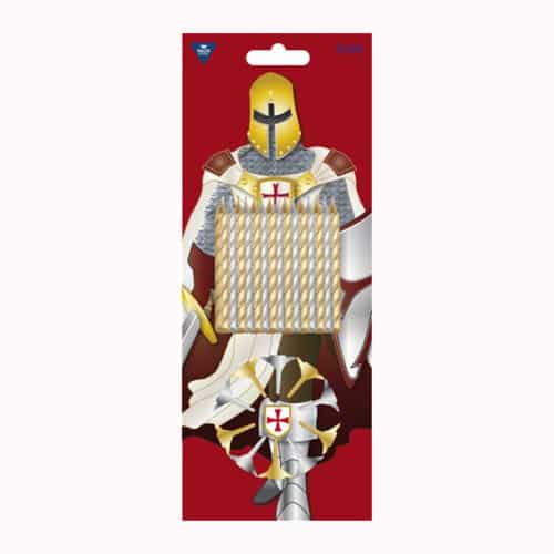 Stoere Ridder kaarsen in de kleuren goud en zilver met bijpassende houdertjes. Gesxchikt voor iedere stoere Ridder taart!