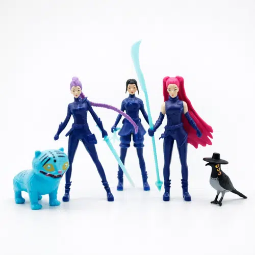 Grappige taartdecoratie set van de dames van Kpop Demon Hunters van de band Huntrix met Derpy en Sussie, de tijger en de ekster uit de animatiefilm. De set bestaat uit 5 poppetjes en wordt geleverd met kleine plakkertjes zodat je ze stevig kan neerzetten op een board of een drum.