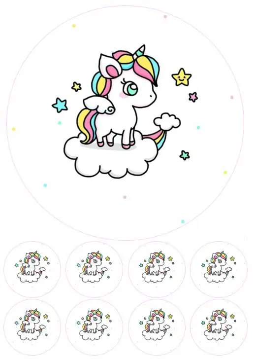 Eetbare Taartprint Unicorn 1 – 18 cm rond + 8 cupcake rondjes
