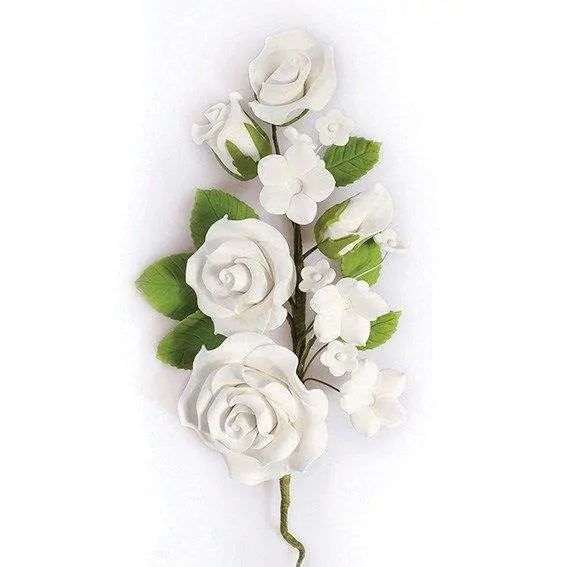 Geen tijd om gum paste bloemen te maken? Dan is dit boeketje echt een uitkomst! Mooie boeketje van witte gum paste rozen van 14,5 cm hoog.