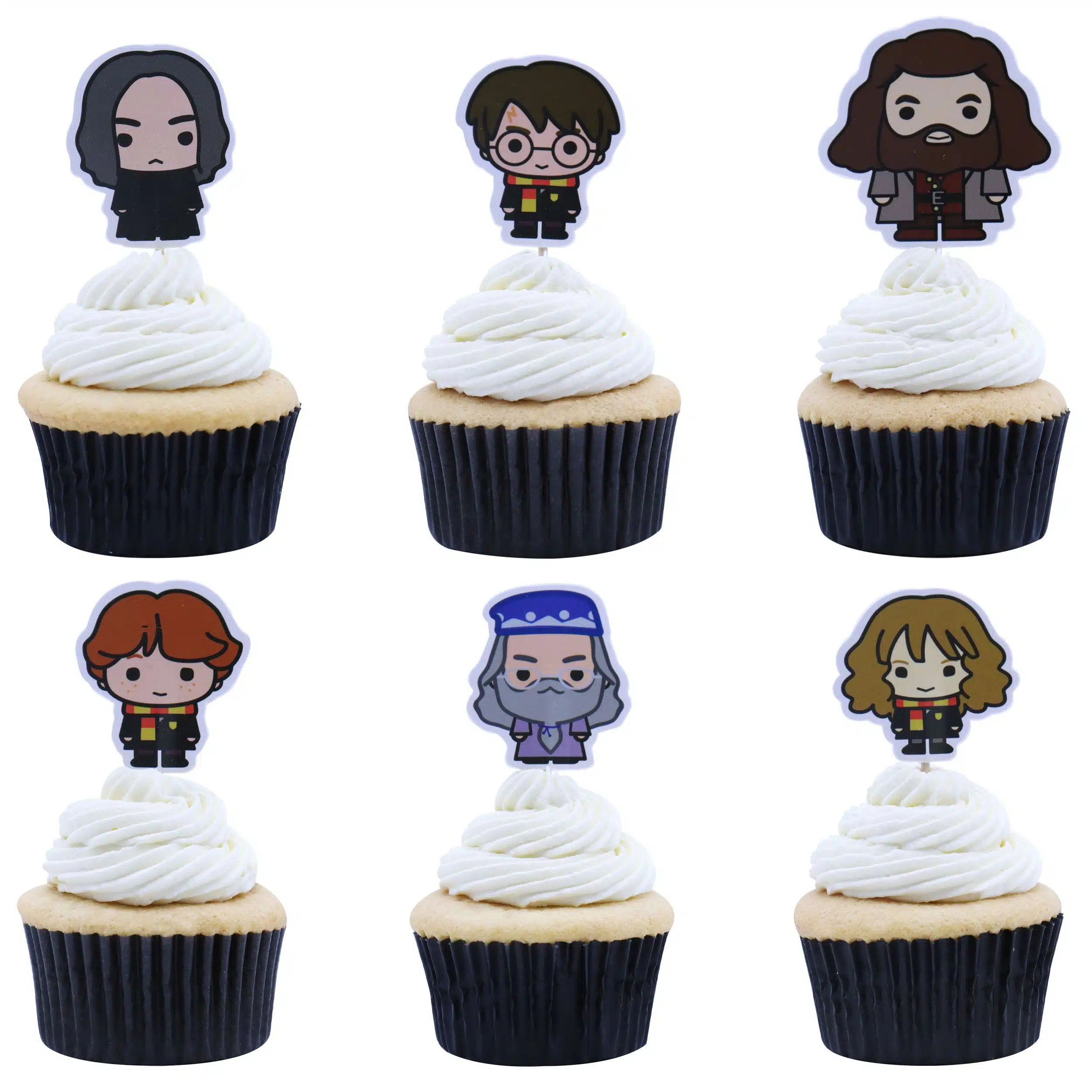Inhoud: 6 cupcake prikkers dubbelzijdig berdukt met afbeeldingen van Harry Potter, Dumbledore, Hagrid, Harry Potter, Hermelien en Ron.