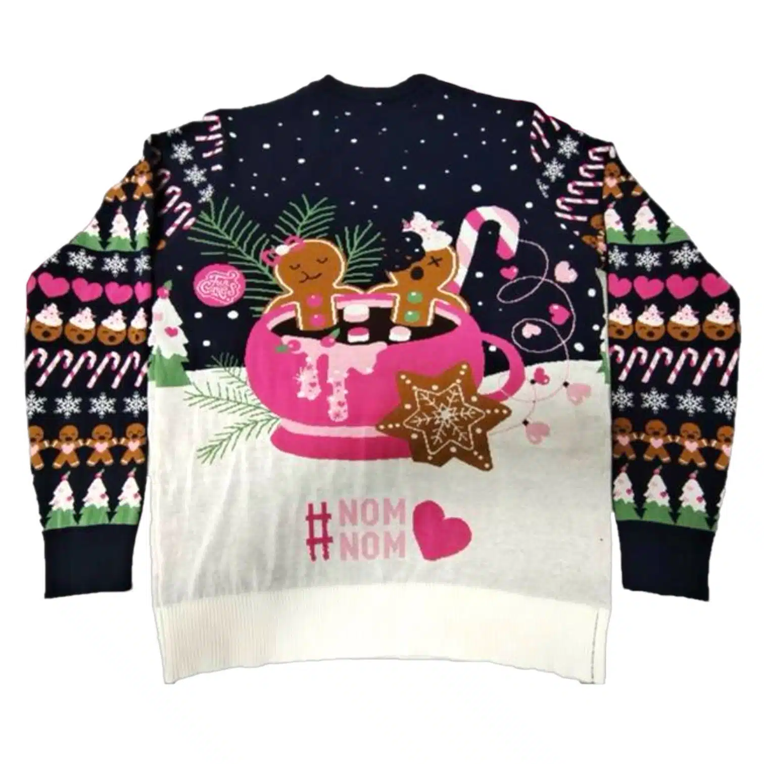 Unieke “foute” Kersttrui met de tekst “Christmas Cookie Crew” op de voorzijde en “#nomnom” op de achterzijde van deze vrolijk gekleurde trui.